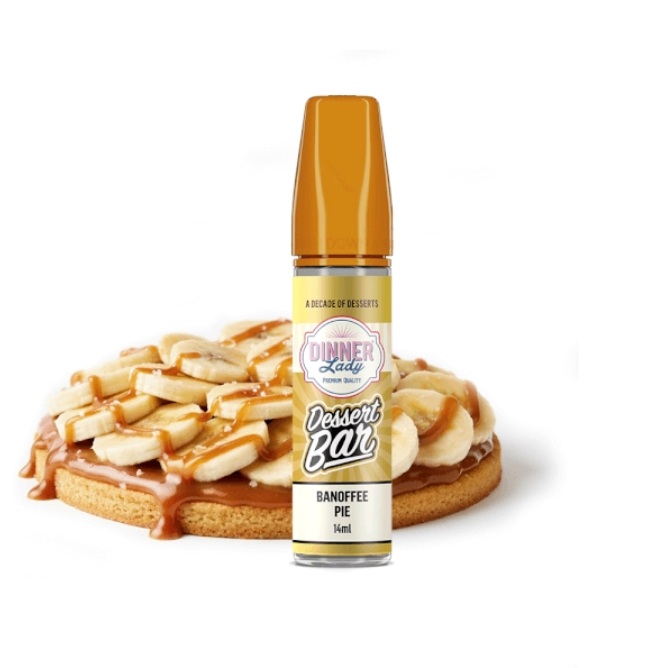 Dinner Lady Dessert Bar Banoffee Pie Aroma Longfill 14ml combina banana madura com toffee cremoso e caramelo salgado sobre uma base de bolacha. Uma sobremesa autêntica, amanteigada e envolvente, ideal para quem procura aromas longfill de tartes cremosas com caramelo de alta qualidade.