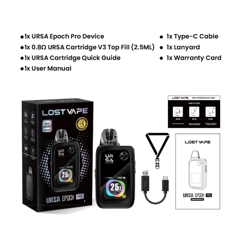 Lost Vape Ursa Epoch Pod Pro Kit. Descobre o novo dispositivo compacto e elegante que redefine a gama Ursa. Com capas de silicone intercambiáveis e design premium, combina estilo e desempenho em partes iguais. Incorpora um ecrã TFT de 1,3 polegadas com interface personalizável, ideal para ver as tuas definições. A sua bateria de 1400mAh oferece autonomia mais que suficiente para todo o dia. Graças à sua potência ajustável de 5W a 35W, adapta-se perfeitamente a estilos de vape MTL e RDL. O cartucho URSA V3 Top-Fill permite preencher pelo topo sem desmontar.