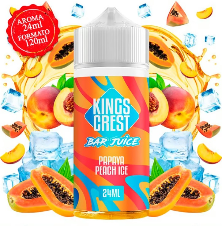 O aroma Papaya Peach Ice da Kings Crest fará com que você desfrute de uma saborosa mistura de sabores doces, pois mistura papaia e pêssego com um toque de frescor.